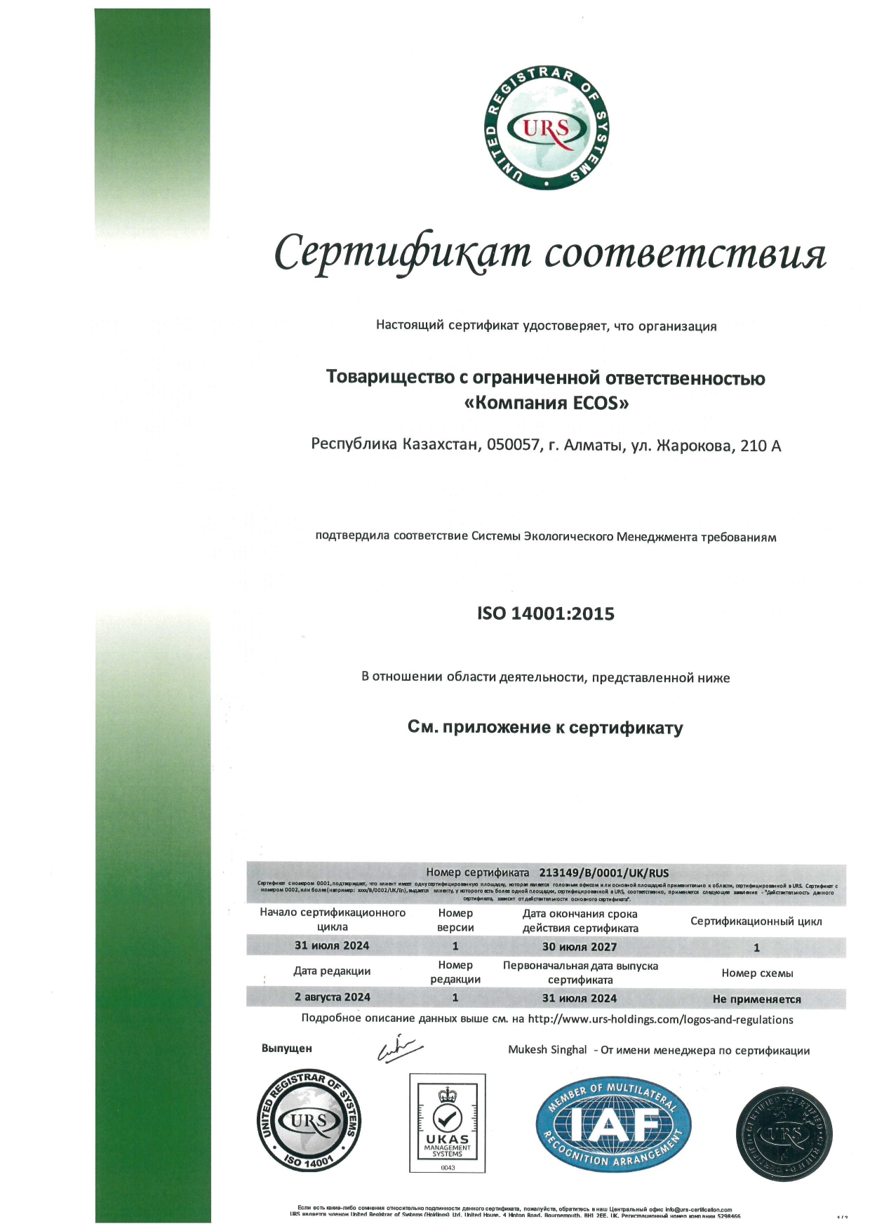 - Подтверждение соответствия Системы экологического менеджмента требованиям ISO 14001:2015;