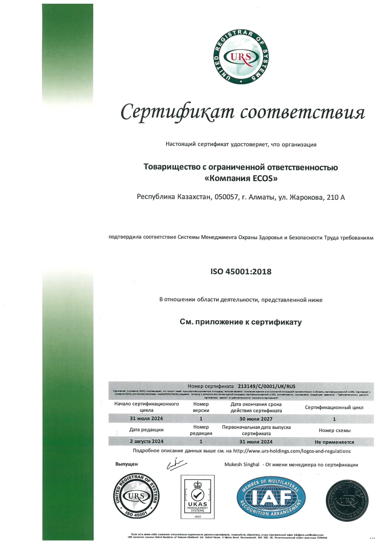 - Подтверждение соответствия Системы менеджмента охраны здоровья и безопасности труда» требованиям ISO 45001:2018.