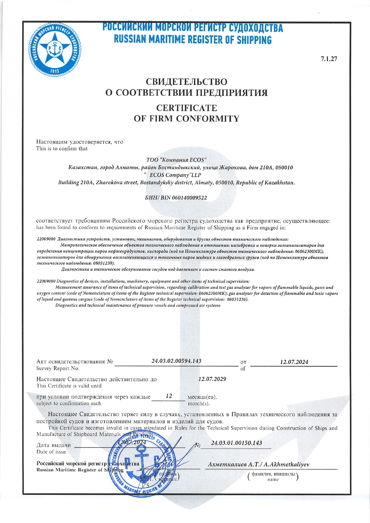 - Соответствие требованиям Морского регистра судоходства (РС) как предприятия, осуществляющего работы по калибровке и поверке газоанализаторов, сервисному обслуживанию дыхательных аппаратов и гидравлическим испытаниям стальных и композитных баллонов;
