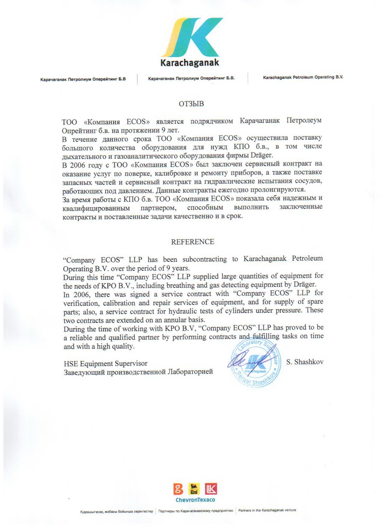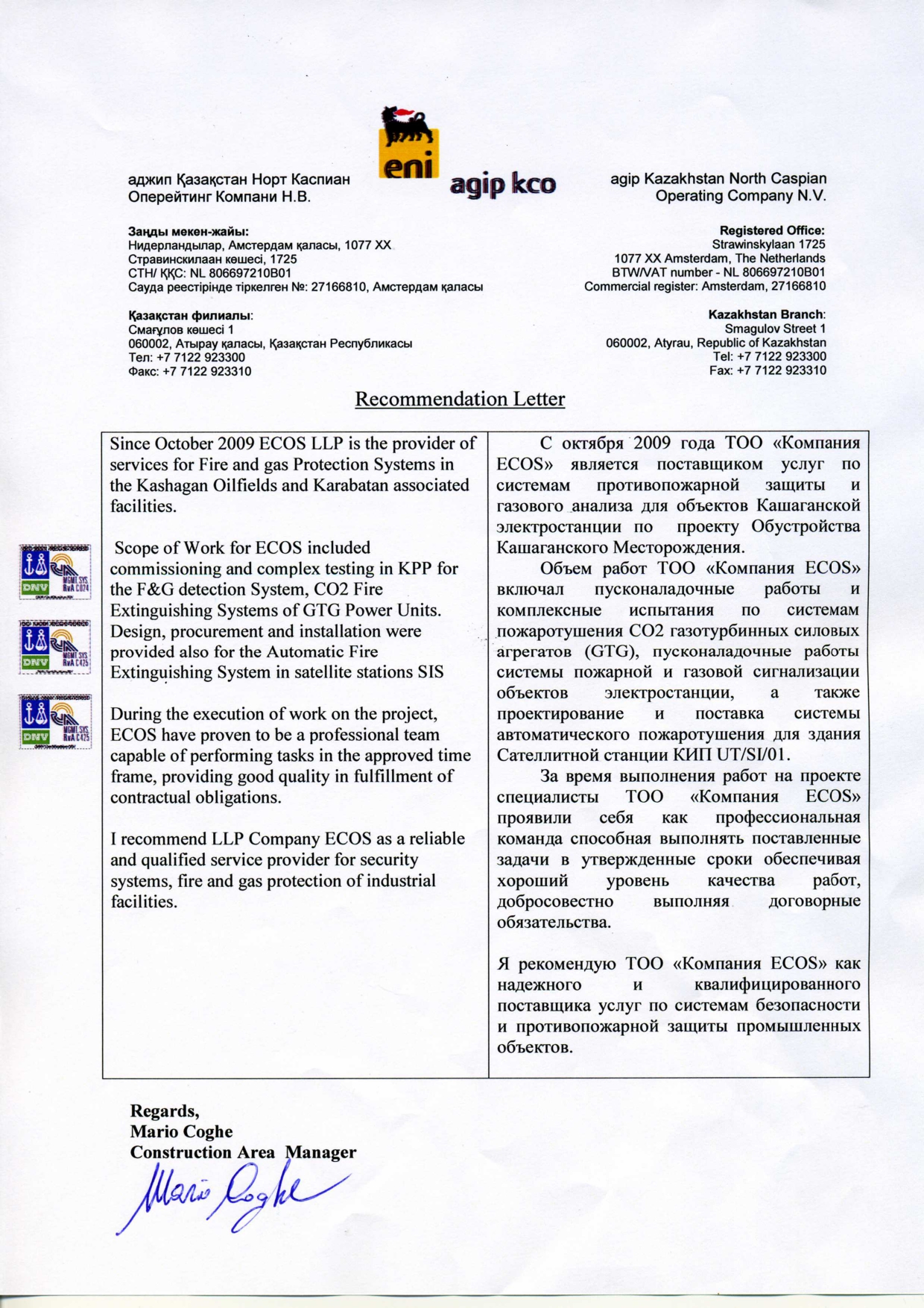 - Пусконаладочные работы, сервисное обслуживание и поставка материалов для системы пожарной и газовой сигнализации и пожаротушения на месторождении Кашаган УКПНиГ «Болашак», (SICIM S.p.A. – Kazakhstan Branch, Agip KCO);