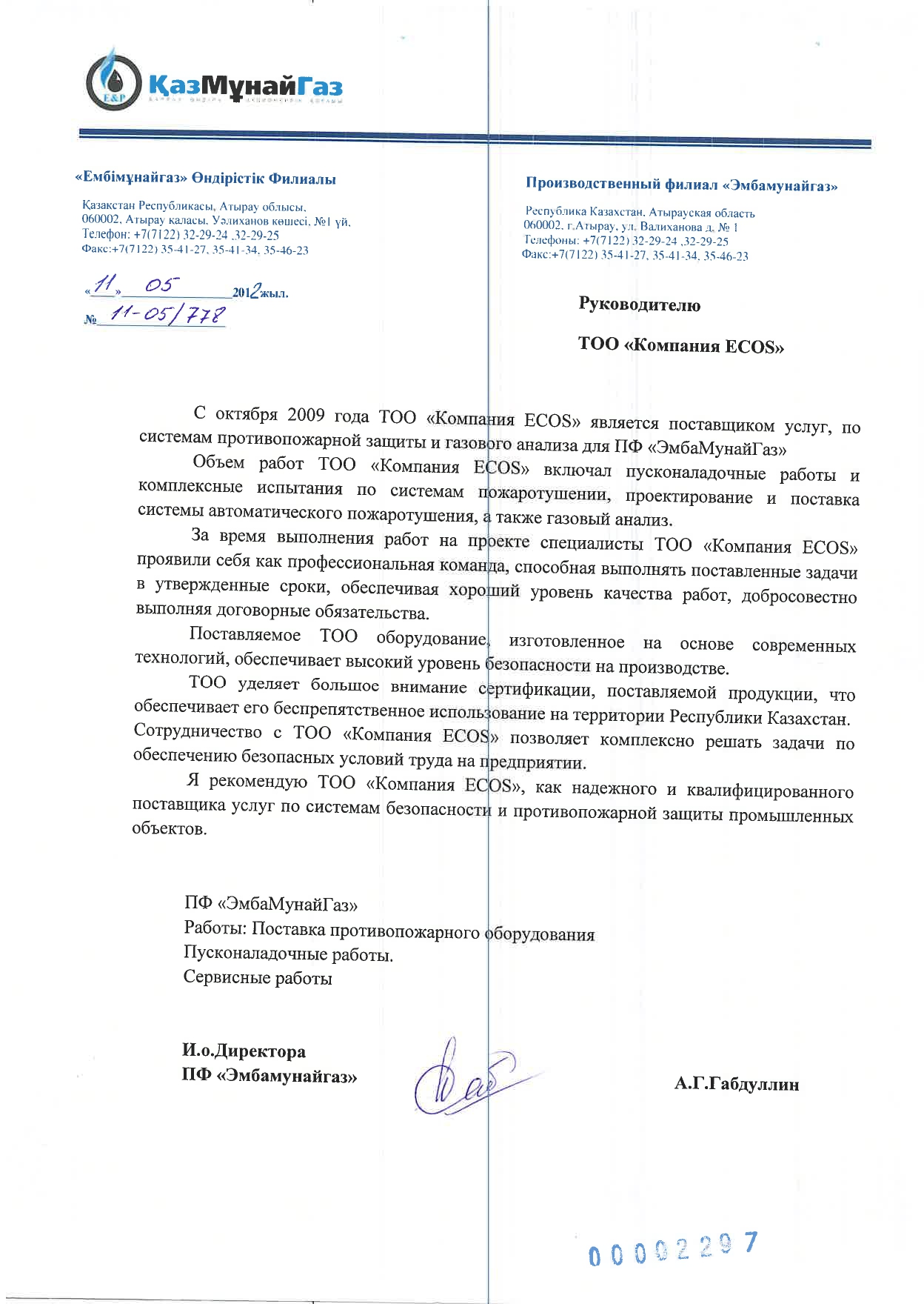 - Автоматические системы газового пожаротушения, пожарообнаружения и газообнаружения, системы оповещения по проекту «Строительство УКПГ Алибекмола и УПГ Кожасай», (ТОО «Казахойл Актобе») – под ключ;